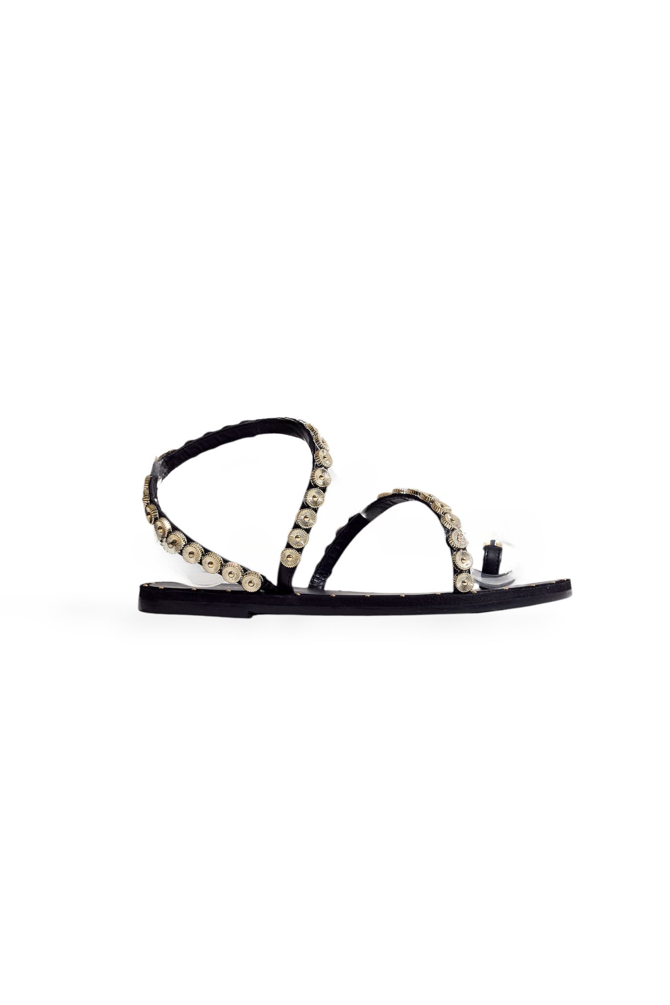 A Sandália Rasteira Eloa é aquele detalhe especial que transforma o look mais básico em uma produção cheia de charme. Seu acabamento artesanal em aplicações metálicas douradas é o grande destaque do modelo, trazendo um toque de sofisticação boho que é a cara do verão.