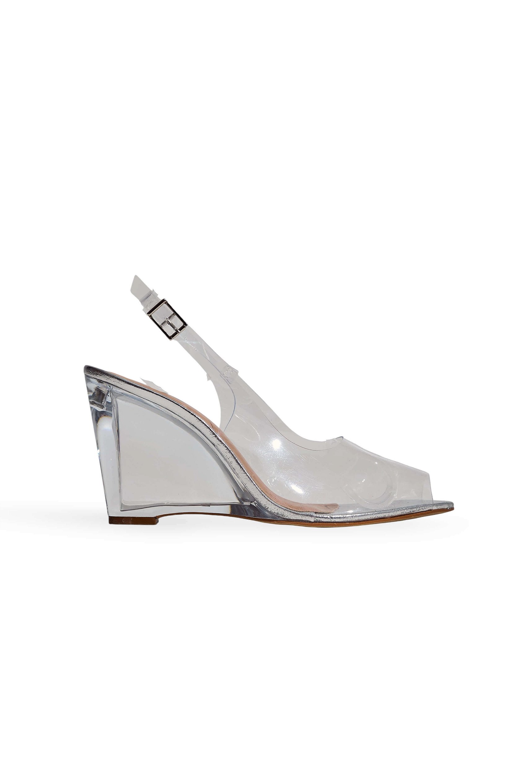 A Sandália Anabela Marine reflete o equilíbrio perfeito entre modernidade e leveza. Seu design em vinil transparente com acabamento prata espelhado cria um visual sofisticado e futurista — tendência confirmada para 2026. O modelo aposta na transparência como protagonista, valorizando os pés e alongando a silhueta com um toque minimalista e elegante.