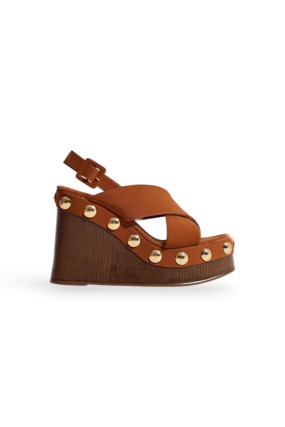A Sandália Plataforma Feminina May traduz o equilíbrio perfeito entre ousadia e conforto. Confeccionada em nobuck camel, ela traz tiras largas cruzadas e aplicações em tachinhas metalizadas, que trazem atitude e estilo moderno.